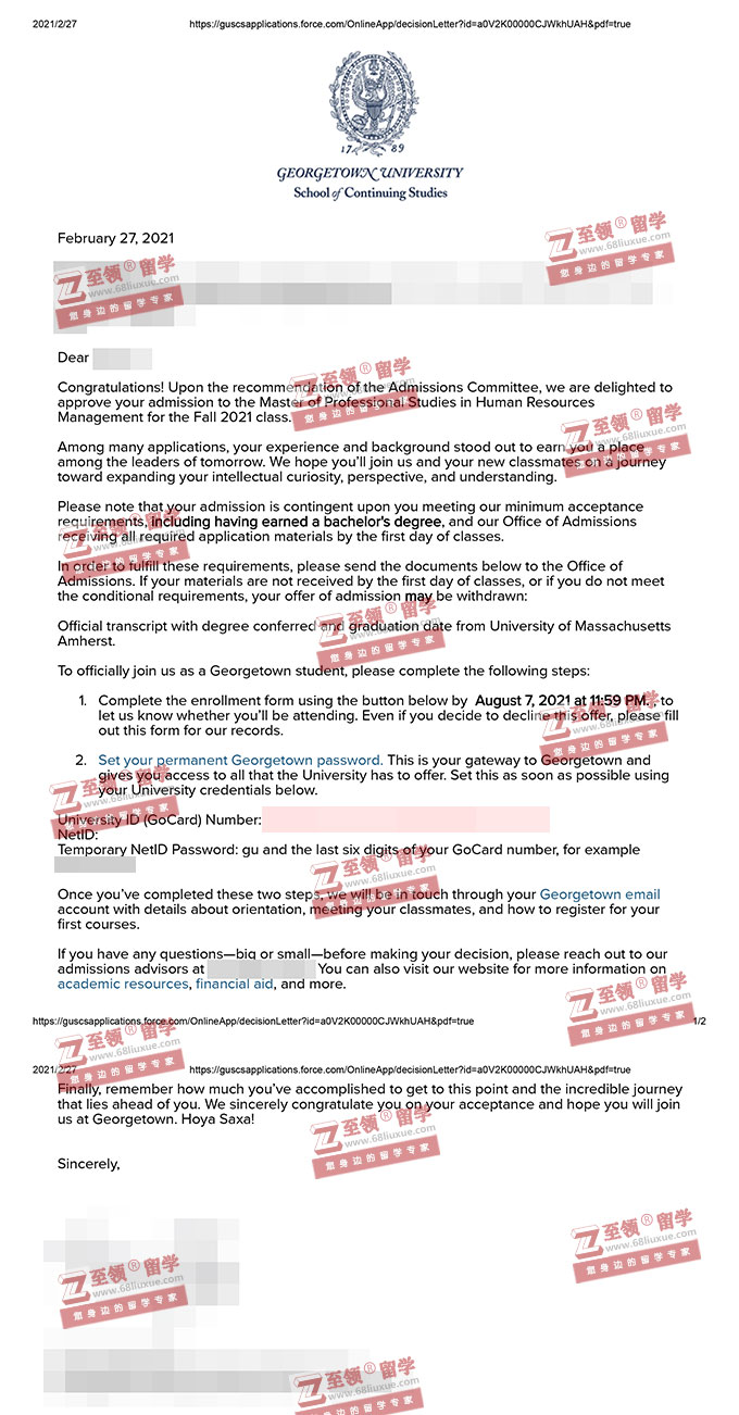 录取结果:乔治城大学,Master of Professional Studies in Human Resources Management录取