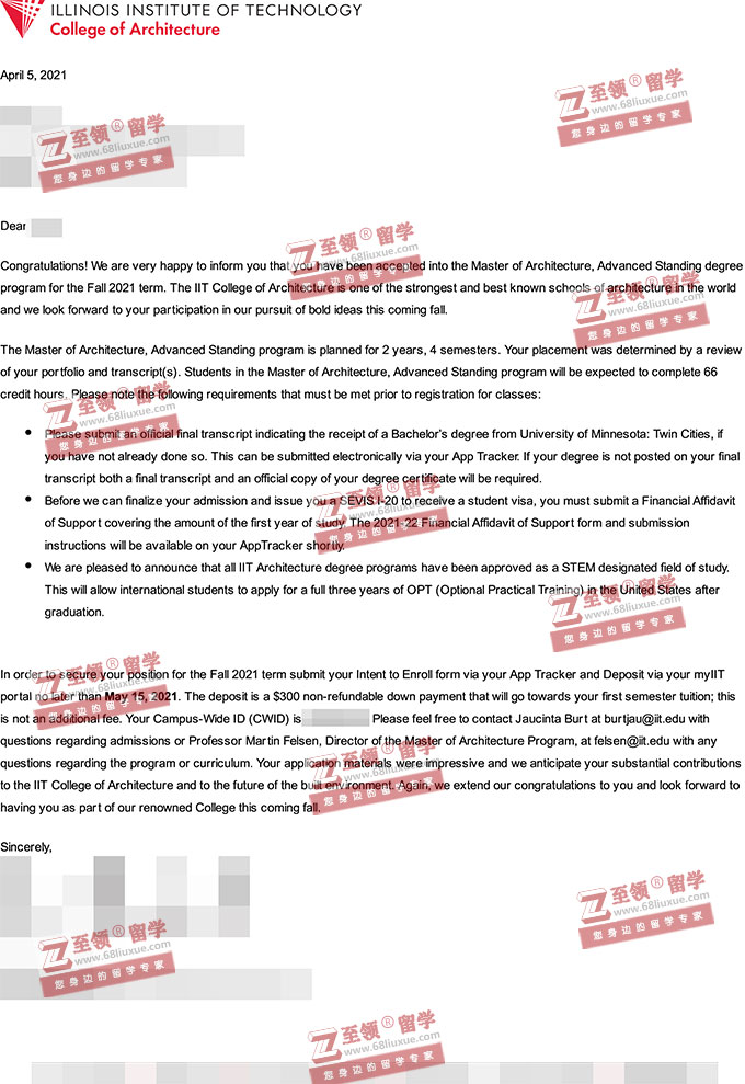 录取结果:IIT,Master of Architecture, Advanced Standing degree program伊利诺伊理工大学建筑学硕士录取,+奖学金$7,095/学期
