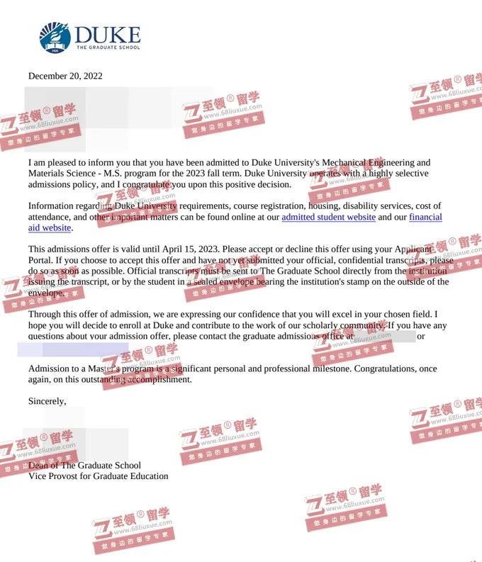 录取结果:Duke University,MS in Mechanical Engineering and Materials Science 杜克大学机械工程硕士录取