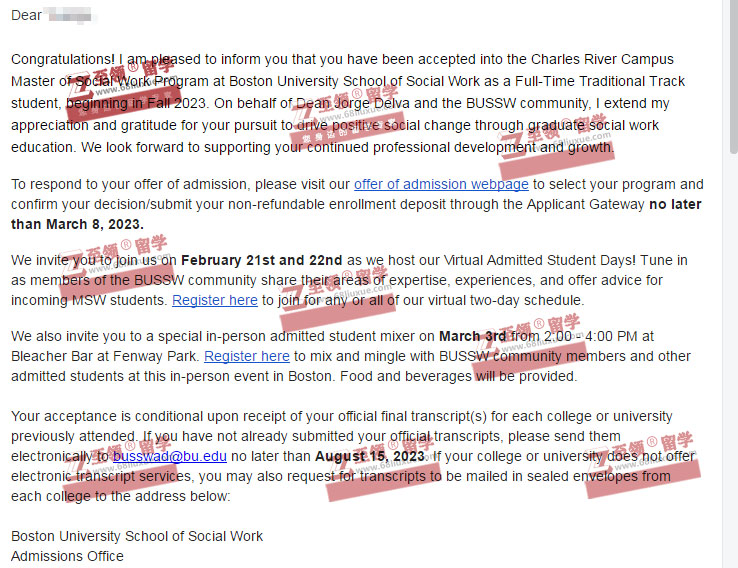 录取结果:Boston University,Master of Social Work 波士顿大学社会工作硕士录取