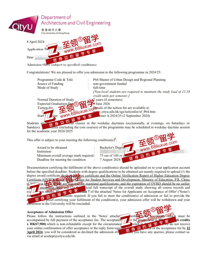 录取结果:The City University of Hong Kong,MS in Urban Design and Regional Planning香港城市大学城市设计与区域规划硕士录取