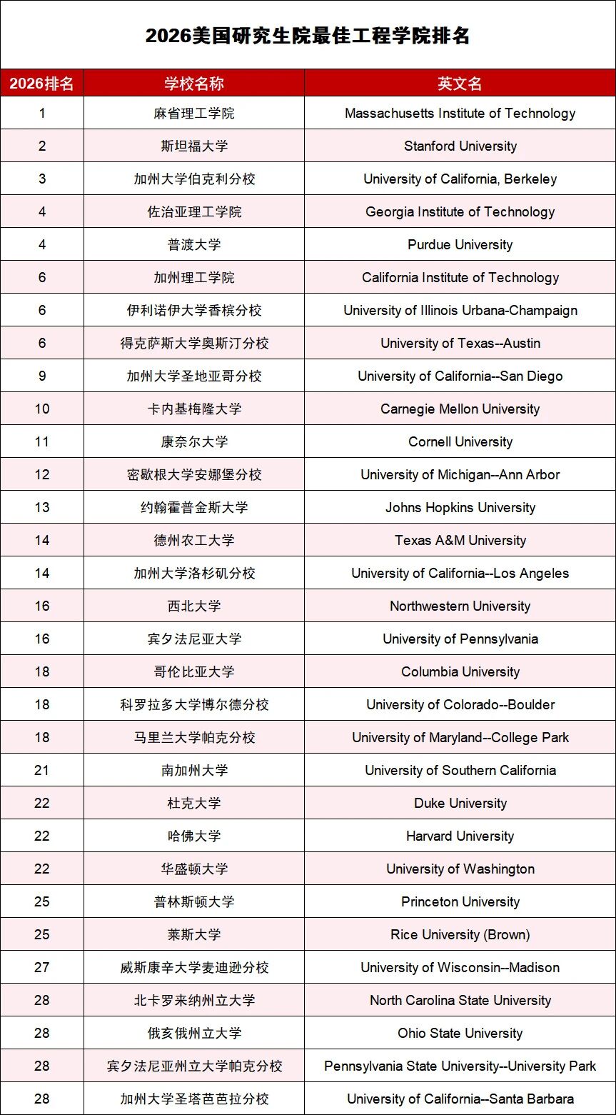 2026年USNews全美最佳工程学院研究生排名