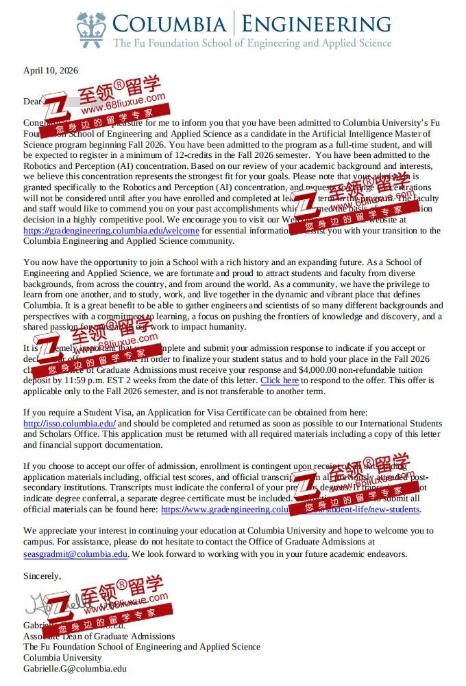录取结果:哥伦比亚大学AI硕士录取