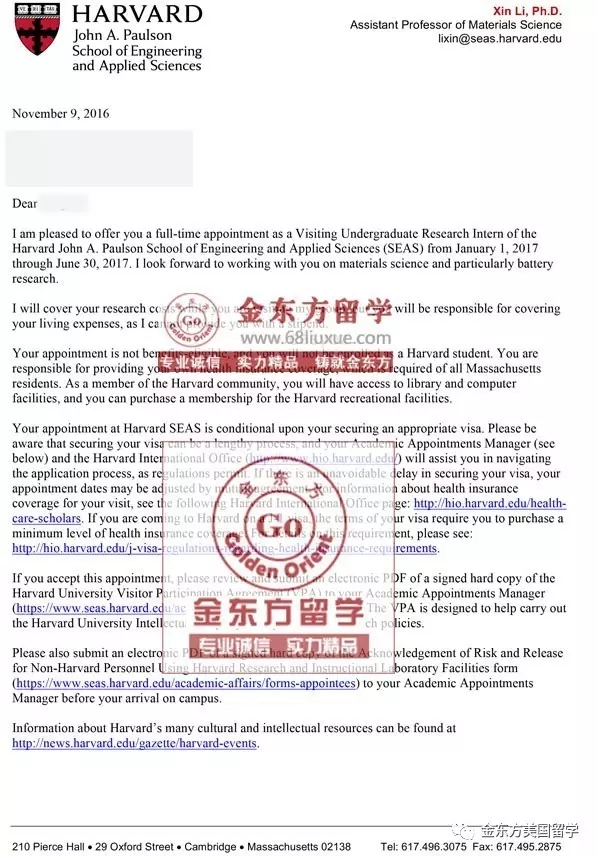 该项目是针对客户自身需求量身定制的。客户将简历和填写的申请表传给我们之后,我们会将客户的需求对接到哈佛大学等学校的校招生委员会,通过他们在学生指定的学院里寻找合适的教授。在有对学生感兴趣的教授之后,我们会安排教授和学生进行面试,通过面试的学生,哈佛大学等招生委员给学生发放正式邀请函,协助客户办理签证。如果没有通过面试,会继续为客户寻找到合适的教授,直到找到为止。通过面试之后的学员,必须前往导师课题组或者实验室中当面学习,在导师的带领下开展学术研究,并承担一部分导师现有项目的工作。整个项目一般需要客户在国外至少做科研2个月以上,推荐信的获得与否要看学生在国外做科研的表现。