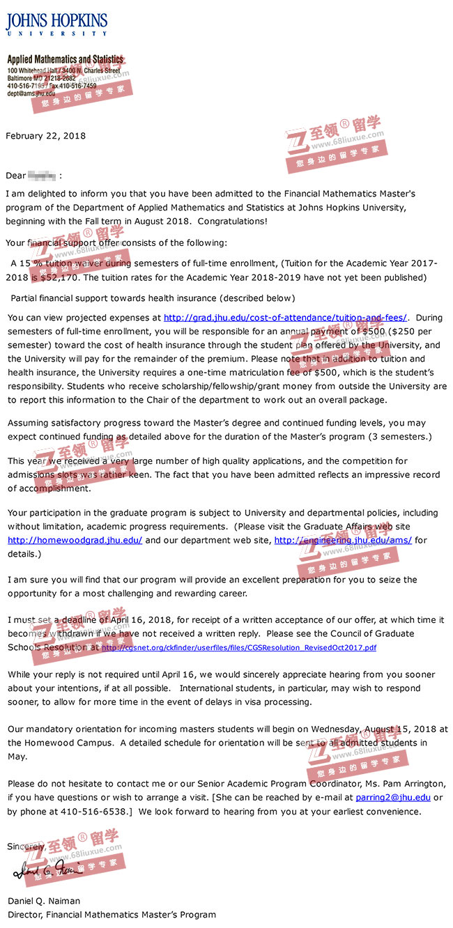 全面细致的准备下,金同学成功获得约翰霍普金斯大学金融数学硕士项目的录取,并且还带有8,000刀/年的奖学金。