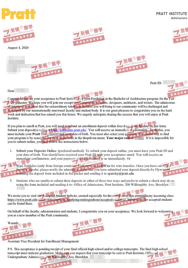 录取结果:Pratt Institute Bachelor of Architecture program 普瑞特艺术学院 建筑学学士